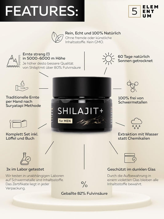 Shilajit ist reich an allen notwendigen Nährstoffen, die Sie brauchen! Zu seinen Wirkstoffen gehören Dibenzo-Alpha-Pyrone (DBPs), Fulvinsäure, Huminsäure, Spurenelemente, Vit A, Vit B-Komplex und viele mehr.